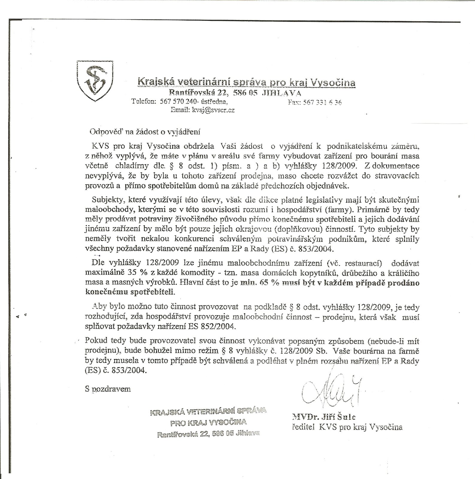 Vážený pane ministře, v příloze si Vás zároveň dovoluji informovat o konkrétním přístupu vysoce postaveného úředníka orgánu státní správy v gesci Ministerstva zemědělství k otázce prodeje ze dvora. Jedná se o oficiální odpověď ředitele Krajské veterinární správy ČR pro kraj Vysočina ze září 2009 soukromému zemědělci, který požádal o vyjádření ke svému záměru vybudovat vlastní zařízení pro bourání masa a chladírny ve smyslu § 8 ustanovení výše uvedené vyhlášky 128/2009Sb.