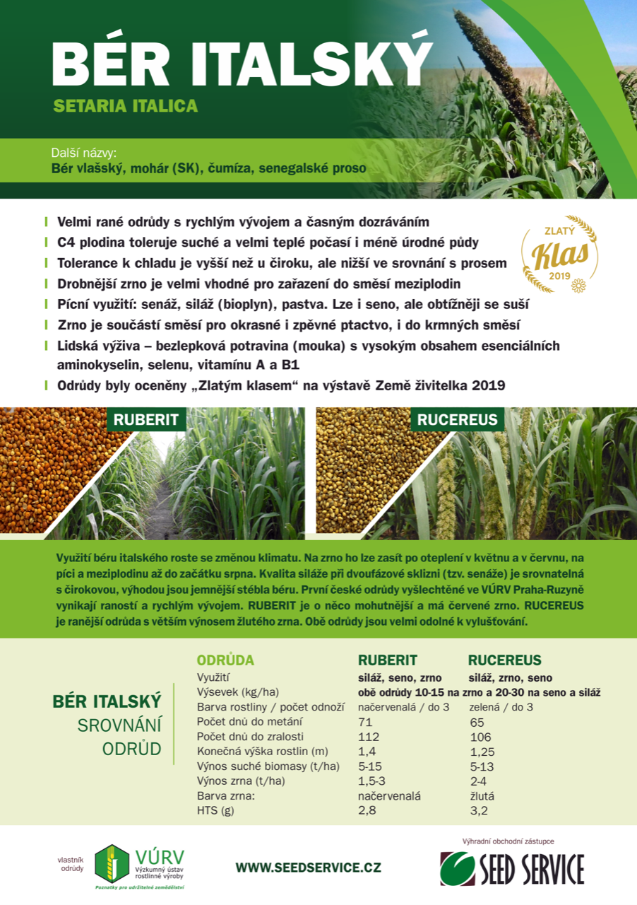 Plodiny jako jsou bér italský nebo čirok zrnový řadíme k plodinám s takzvanou rychlou C4 fotosyntézou, která se velmi dobře uplatňuje v podmínkách měnícího se klimatu v ČR. „Lépe hospodaří s vodou a zaručují stabilní výnosy a široké využití i při horších podmínkách v průběhu vegetace, jako jsou vysoké teploty a sucho. Šlechtěním ‚vlastních‘ odrůd pro podmínky českého zemědělství se tak připravujeme na případnou budoucnost, pokud nás klimatické změny přivedou k ještě delším obdobím sucha a vyšších teplot. Jak bér, tak čirok lze využít také jako hodnotné letní strniskové meziplodiny,“ říká Jiří Hermuth a vysvětluje: „V posledních letech nedostatek vody a vyšší teploty vzduchu i půdy vyvolávají časnější termíny sklizně zrnin. To vede k prodlužování meziporostního období vhodného pro pěstování právě strniskových meziplodin. Klimatické změny nás nutí ještě relativně včas hledat jejich nové, odolnější druhy, především právě ve skupině rostlin s C4 typem fotosyntézy,“. Bér je schopen vyklíčit i při zhoršených podmínkách a produkovat stabilní výnosy zrna i biomasy, kterou lze využít nejen pro krmné účely, ale třeba i k výrobě bioplynu. Hojné porosty těchto plodin také vytvářejí v letním období kýžený úkryt pro polní zvěř a v době květu se stávají velkým lákadlem pro včelstva. Na rozdíl od jiných obilovin navíc nepřenáší obávané onemocnění způsobené různými druhy hub z rodu Fusarium, ani choroby pat stébel.