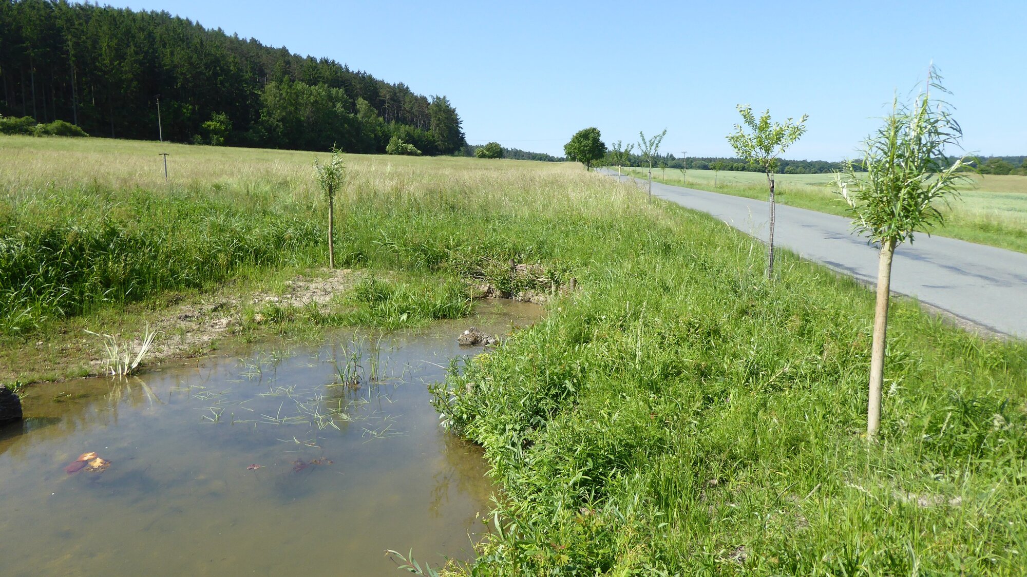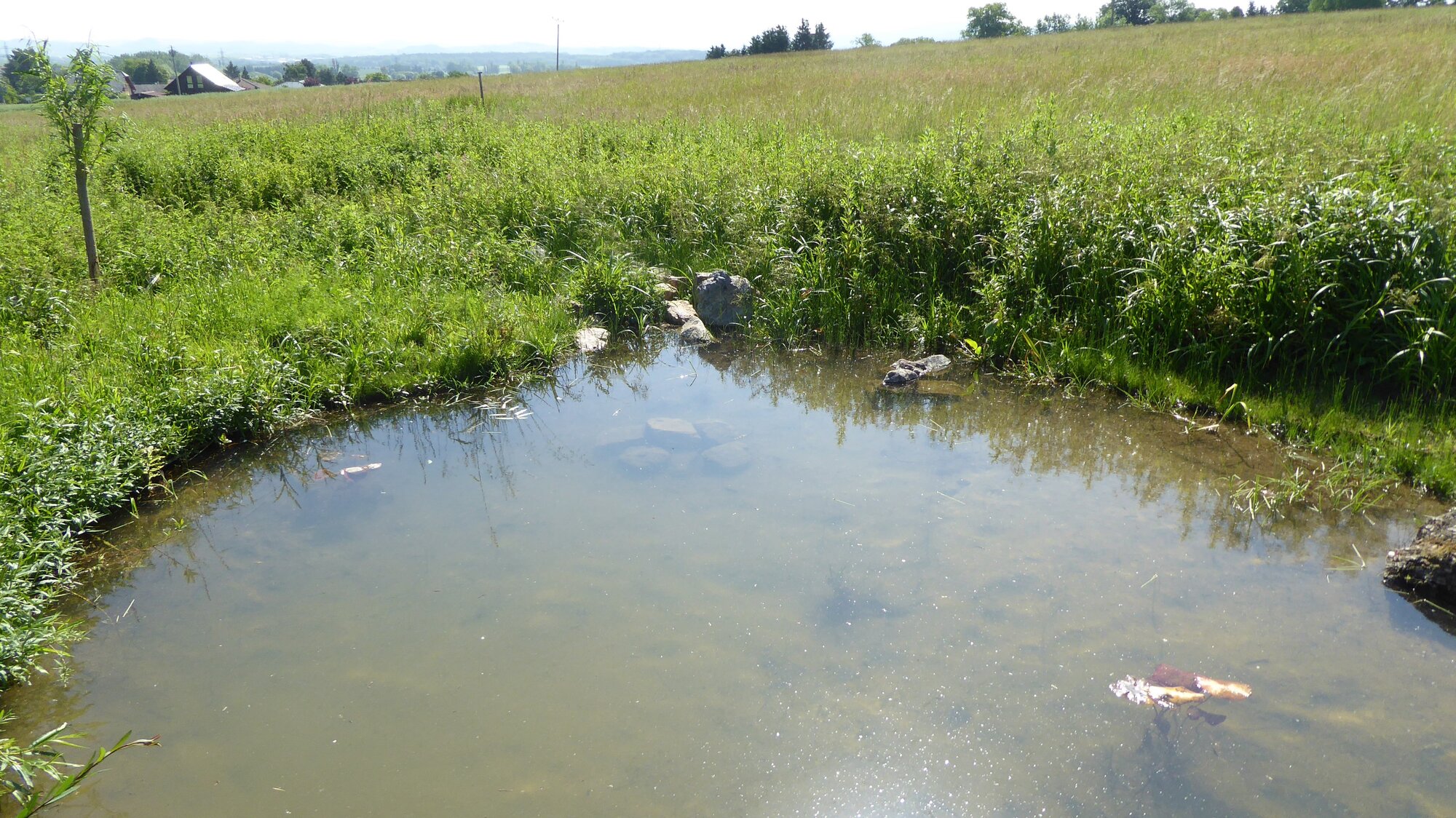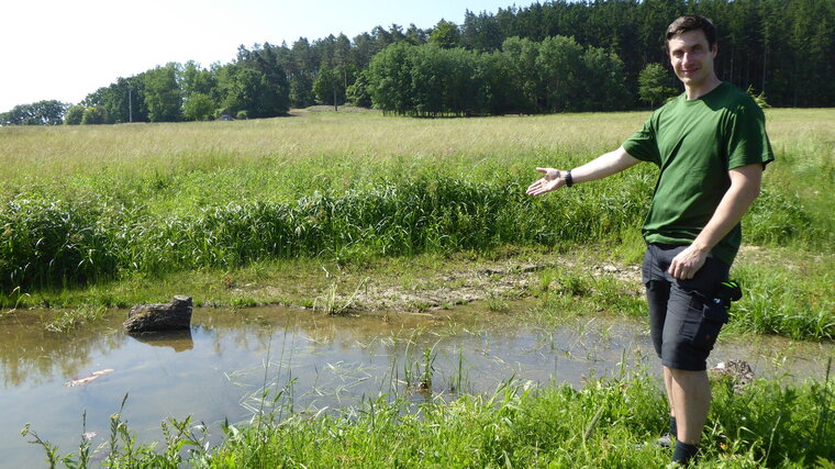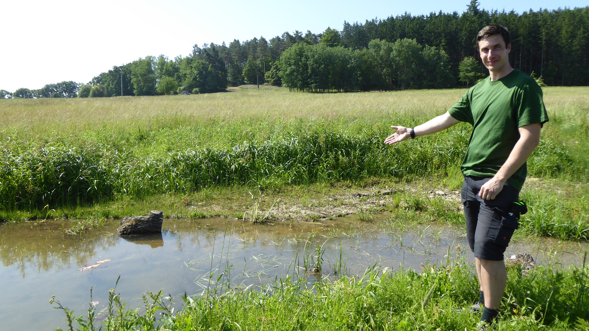 Neměl, pro vodní plochu do 300 metrů čtverečních, která nemá stavebně zpevněné břehy, což znamená, že se použije pouze přírodní materiál, jako kámen, hlína nebo dřeviny, není potřeba žádné stavební povolení. Nezbytný však je souhlas majitele pozemku. V tomto případě bylo velkou výhodou, že majitelem pozemku je naše rodina, konkrétně matka, takže nebyl problém. A nyní se snažím, aby stavba byla zařazena jako VKP, tedy výjimečný krajinný prvek, takže jako zemědělec bych měl tuto plochu vedenou jako úhor, což je další pozitivum, tedy kromě biologické prospěšnosti samotné tůňky. Nejde tedy jen o zadržování vody, ale o diverzifikaci, o zdroj pitné vody pro celou řadu živočichů, objevují se tu srnky, vodu vítají ptáci, už se byly podívat kachny, za svou tůňku přijal hmyz, potápníci, vodoměrky, a byl bych moc rád, aby zde našli domov i čolci a mloci.