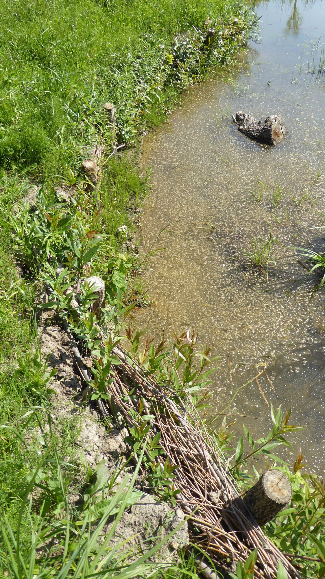 Ano, a to mě právě přivedlo ke spolupráci s panem projektantem, že používá přírodních materiálů. Hatě jsou starobylý způsob úpravy břehů, který je opravdu funkční. My jsme začali tak, že jsme do budoucích břehů za pomoci bagrové lžíce zarazili dubové, asi dvacet až třicet centimetrů tlusté kůly, v metrových rozestupech. Odškrábli jsme ornici, tak asi 30 až 50 centimetrů, až na jílové podloží, někde to bylo hlouběji. Ale pak jsme na dno něco ornice zase vrátili, aby vzniklo prostředí příznivé rostlinám i živočichům. A to haťování, to je výplet mezi zatlučenými kůly, do výšky zhruba 50 centimetrů. Na vyplétání se používají dvouleté vrbové pruty, 2 až 3 cm v průměru. Pruty musejí být živé, sklizené 14 dní před použitím. Tím jsme vytvořili jakousi hráz a teď očekáváme, že zakoření, vrby porostou a nové pruty se budou moct sklízet a používat na další podobné účely. Navíc jsem okolo vysadil solitérní vrby košíkářské, jejichž pruty se dají sklízet každé dva tři roky, no a pak z nich plést!