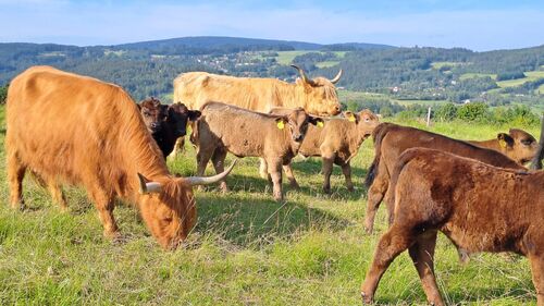 Polovina obhospodařované výměry jsou louky, druhá pastviny. „Naše zvířata rotují na pastvinách ve třech katastrech, vždy po deseti dnech je přeženeme na jinou pastvinu. Osvědčila se nám kastrace všech býků, kterou absolvují v sedmi měsících věku. Všechny volky i většinu jaloviček necháváme porážet, highlandy ve 36 měsících, křížence ve 24, každý rok si necháváme dvě jalovičky do chovu. V letošním roce jsme přikoupili 6 matek a několik ročních zvířat, abychom byli připraveni na rostoucí poptávku po mase,“ informuje farmářka.