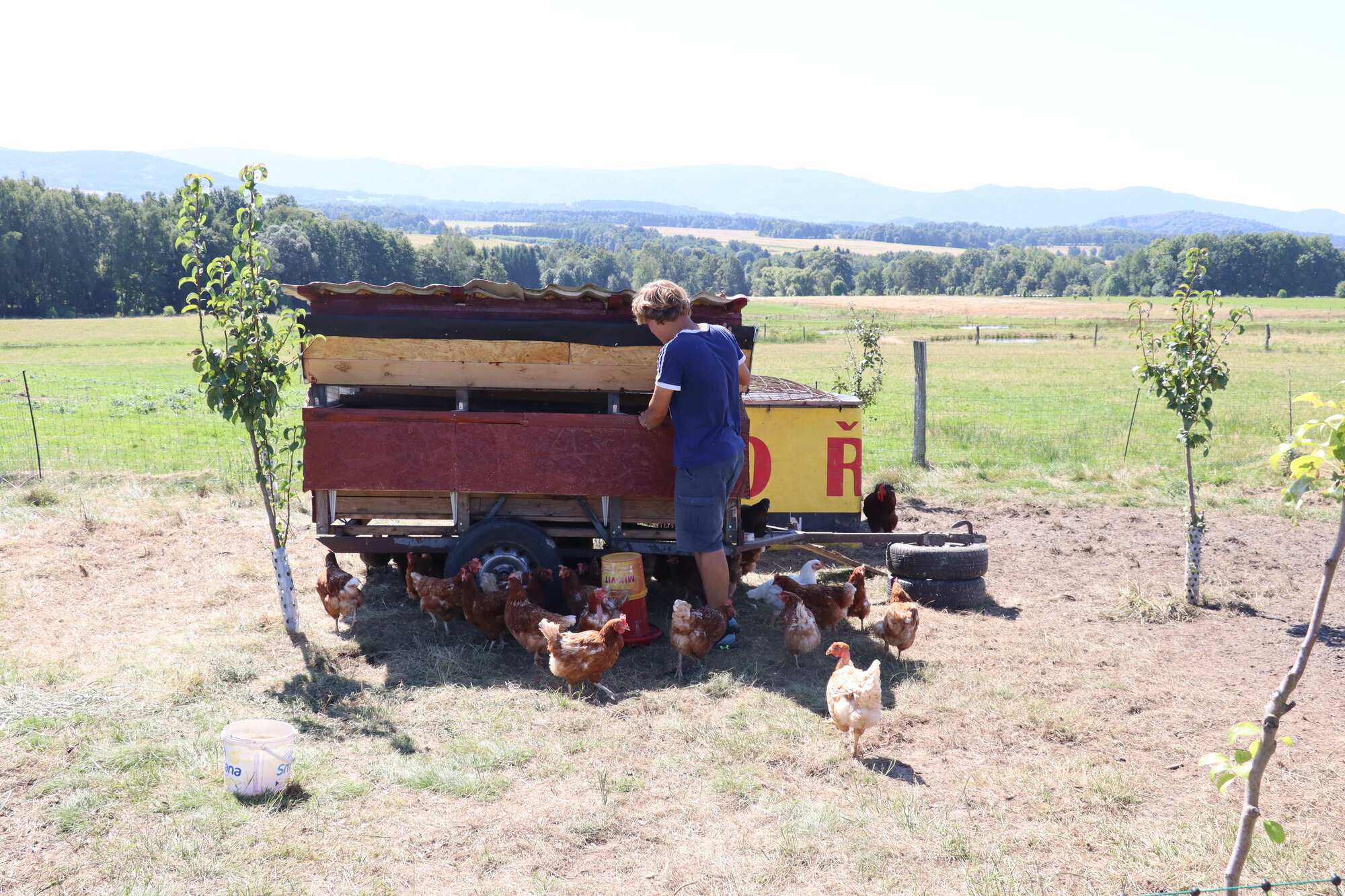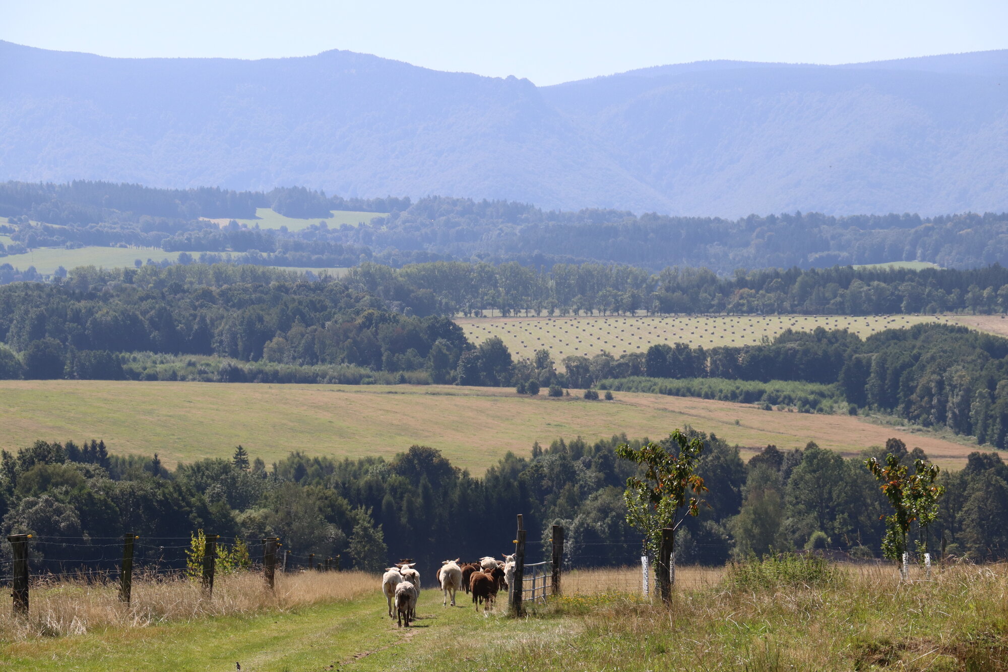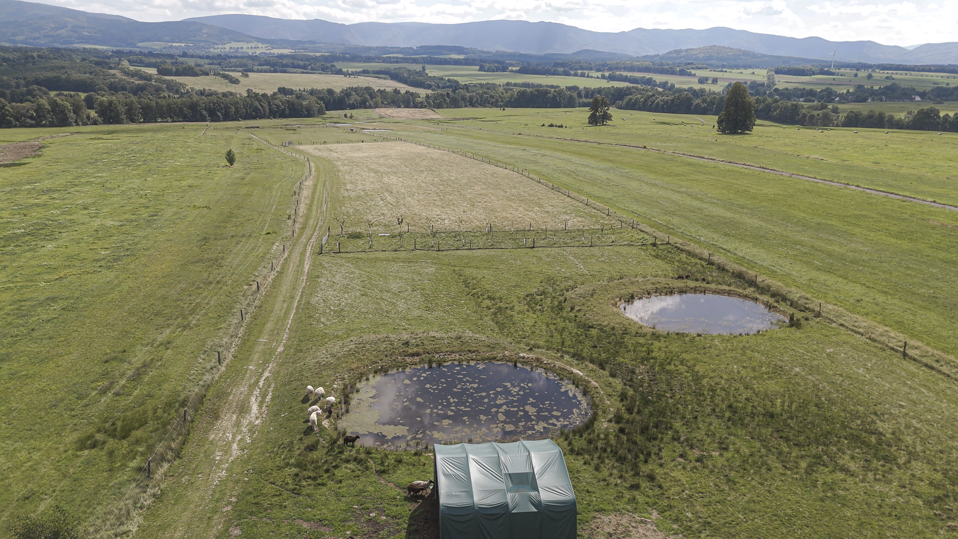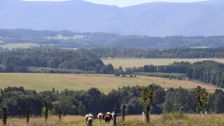 Na horní hraně pastviny nově stojí chatky pro méně náročné hosty hledající klid a obdivující zdejší krajinu. „Protože jsme na malé ploše, diverzifikujeme naše činnosti a hospodaříme tak, abychom oživili půdu a krajinu a zlepšovali jejich kvalitu,“ vysvětluje Karel Mařík.