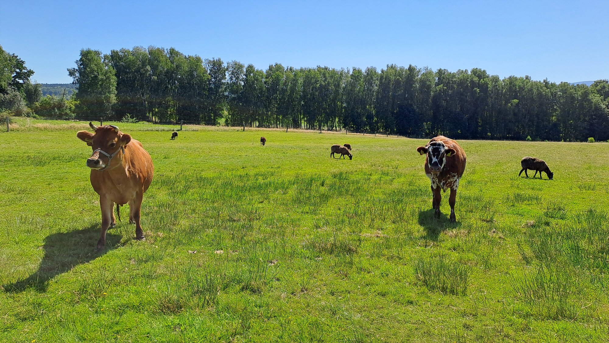 Farma hospodaří na 36 hektarech pronajaté zemědělské půdy, která je ve většině případů zatravněná. Zdejší podhorská krajina, kterou na jižní straně zadumaně rámuje panorama severní strany Jizerských hor, je s velkými plochami travních porostů profilově zajímavá, ale biotop je jednostranný a ekologicky fádní. Hospodář se proto snaží o zapojení agroekosystému - o návrat života do trvalých travních porostů. Na pastvinách se pase smíšené stádo asi 20 kusů normandského skotu a také skotu plemen jersey. Obě plemena jsou s rozmyslem vybrána pro provoz a zpracování surovin na ekologicky vedené farmě – jersey je malé, dojné plemeno charakteristické vysokým obsahem bílkoviny a tuku v mléce. Normandské plemeno je optimální pro chov na ekologických farmách, je vyšlechtěno na pastevní způsob chovu a má vysokou konverzi živin. Skot na pastvině ještě doplňují ovce převážně hnědého plemene zwartbles, které má kombinovanou užitkovost, a i přes líbivý exteriér je vysoce produktivní a vhodné ke spásání podhorských travnatých ploch. Vedle ovcí a skotu se v přilehlé ohradě pase pět koní. V sadech mají ještě volný výběh nosné slepice i drůbež na výkrm. Drůbež má na starosti ukrajinský mládenec Mikola, student třetího ročníku Střední zemědělské školy ve Frýdlantu, obor agropodnikání, který ve volném čase získává na farmě praktické zkušenosti. Když je potřeba, vypomáhá hospodáři Karlovi také manželka Lucia Lea. K ochraně proti predátorům na loukách slouží elektrické ohradníky. Hospodář se zabývá racionálním a šetrným využitím pastvy pro různé kategorie a druhy hospodářských zvířat. V nejbližší budoucnosti plánuje vybudovat mlékárnu a sýrárnu s možností prodeje koncovým zákazníkům. Zatím zkouší pasterizační stroj pro vlastní spotřebu mléka, tvarohu a sýru.