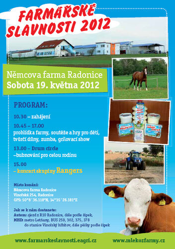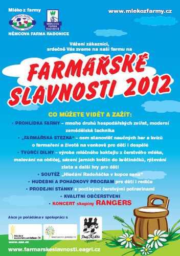 grilovací show v podání Redhotů – týmu dvojnásobných mistrů České republiky v grilování – si budete moci v Radonicích prohlédnout farmu s mnoha druhy hospodářských zvířat a moderní zemědělskou techniku. Pro děti i dospělé bude nachystána osvědčená farmářská stezka s osmi stanovišti naučných her a kvízů o farmaření a životě na venkově, tvůrčí dílny (výroba mléčného koktejlu z čerstvého mléka, malování na obličej, sázení jarních květin do květináčků, rýžování zlata a další hry), soutěž „Hledání Radoňáčka v kupce sena“ a hudební a pohádkový program. O zlatý hřeb dne se postará slavná country skupina Rangers.