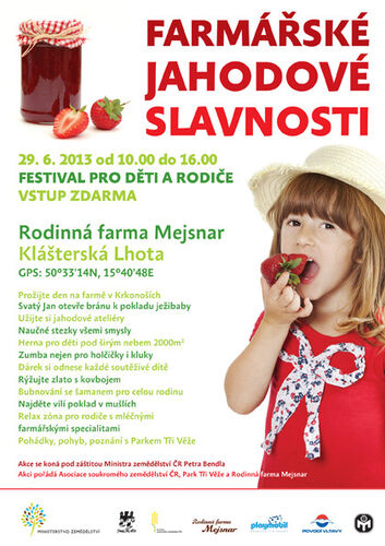 Letošní jahodové slavnosti jsou již třetí mega akcí tohoto typu, kterou Mejsnarovi pořádají. „Neuvěřitelné úspěchy Farmářských slavností na naší farmě v loňském a předloňském roce i nečekaně vysoká návštěvnost nás inspirovaly k tomu uspořádat podobnou akci i letos. Myšlenka přivést na dnešní moderní farmy rodiny s dětmi a ukázat jim skutečný život na venkově, nám připadá ohromná. Upravuje se tak jejich, bohužel, mnohdy negativní mínění o farmářích, jejich práci a stylu života. Probudit v dětech opět zájem o přírodu, zvířata a prostředí, ve kterém žijeme, připomenout jim nejrůznější tradice – v tom vidím velký příslib do budoucna. A zemědělství obzvlášť je odvětvím, které potřebuje mladé lidi jako sůl,” říká Alois Mejsnar.