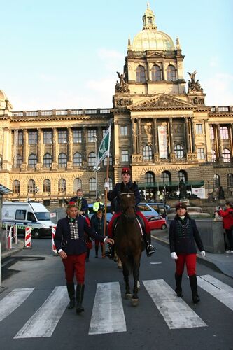 z Washingtonovy ulice k tribuně u sochy sv. Václava. Jednatel Sboru Selských jízd František Sáček pronesl zdravici, v níž vysvětlil přítomným heslo „Věrni půdě, věrni sobě, věrni vlasti“ s poukázáním na sílu tradice a závazek k odkazu předků. Kardinál Duka předal oběma praporům pamětní stuhu. „Bohužel se mi nepodařilo vzbudit Blanické rytíře, přijela ale Selská jízda jakožto příslib naděje nám všem,“ řekl s úsměvem kardinál.