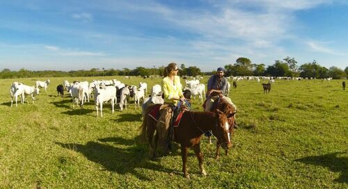 Žije u nás šest rodin a farma má tisíc šest set hektarů. Dobytka asi 2.500 kusů. Máme ještě takový menší chov asi o čtyř stech kusech, chováme na maso. U nás se pracuje s pastvinami, každá je vhodná na něco, pro jalovice, pro býky, pro menší nebo větší kusy. Říká se tomu Manejo [manežo], to je ten způsob hledání těch správných pastvin a „točení“ jednotlivých stád po různých pastvinách, aby každé zvíře dostalo, co potřebuje, a optimálně přibývalo, a zároveň aby se porosty uchovaly zdravé a přirozeně se obnovovaly.