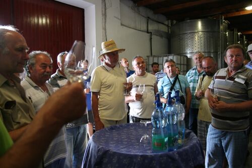 Cestou zpět na farmu naše ekipa neplánovaně zastavila na krátkou exkurzi ve vinařství zdejšího starosty pana Balogha. Ten hospodaří na 300 hektarech vinic, kde pěstuje bílé i červené odrůdy vín, které jsou vybírány podle vhodnosti do zdejších suchých podmínek, aby nebylo nutné zavlažovat. Už z výměry je zřejmé, že se jedná o víceméně průmyslovou produkci hroznů, které se sklízejí kombajny, zpracovávají v drtivé většině na mošt a ten se exportuje zejména na Slovensko k dalšímu zpracování. Výnosy se pohybují kolem tuny na hektar, vlastní víno ale vyrábí pan Balogh jen z malé části a nutno říct, že jeho kvalita dost odpovídá celkovému přístupu k pěstování révy.