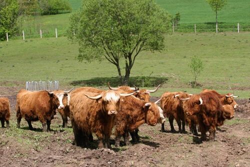 Z 83 obhospodařovaných hektarů zaujímají malou část pastviny, které celoročně využívá stádo 17 kusů skotského náhorního skotu. „Pro chov tohoto extenzivního masného plemene jsem se rozhodl již před patnácti lety a byla to sázka na jistotu. Díky absenci moderních selekčních postupů se chová v nezměněné podobě již od 18. století a tvrdé horské podmínky, skromná pastva a celoroční volný pohyb v přírodě formovaly jeho konstituci a zdraví. Zvířata jsou proto odolná, otužilá a nenáročná. Porody probíhají bezproblémově, ve stádě, telata jsou velmi životaschopná a samostatná, není je nutno oddělovat ani jim poskytovat zvláštní péči. Kromě významu pro údržbu krajiny je toto plemeno ceněno i svým masem špičkové kvality, u konzumentů jsou oblíbené hlavně steaky chutí podobné zvěřině,“ vysvětluje František Pospíšil a dodává: „Jedinou stinnou stránkou chovu je nekázeň či nepřejícnost ze strany některých lidí. Často nacházím přestřihané ohradníky, mizí tyčky, zkrátka nic příjemného.“