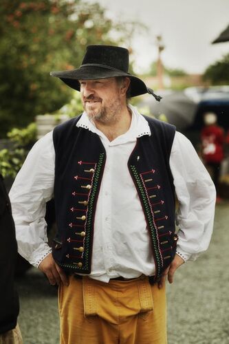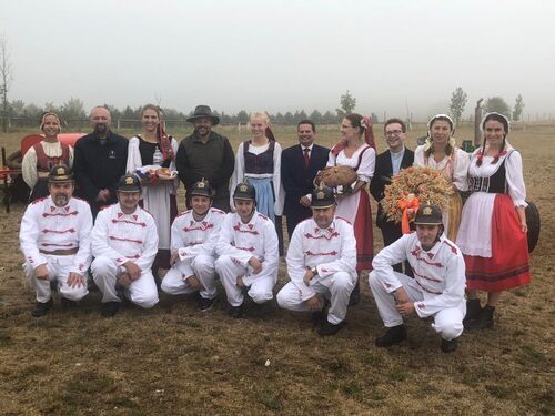 Těmi byli pan farář a starosta města Votice Jiří Slavík, šestičlenné mužstvo hasičů v dobových uniformách ze sousedních Martinic a děvčata v krásných selských krojích. Hospodář zapřáhl pár koní do nazdobeného kočáru a pana faráře se starostou přivezl ze sousední vesnice až na louku před statkem, kde všichni čekali na zahájení dožínkových slavností.