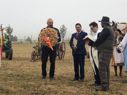 Dožínkový věnec hospodáři požehnal farář Augustin Slatinka z Dobrušky, který s námi nakonec také poseděl a prodiskutoval nejen otázku duchovna, ale také morálních hodnot, českého venkova i sedláků. Těch mimochodem na akci dorazila také pěkná řádka.