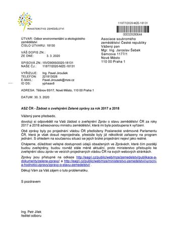 Na základě žádosti ASZ ČR zveřejnilo Ministerstvo zemědělství Zprávy o stavu zemědělství (tzv. Zelené zprávy) za roky 2017 a 2018, které delší dobu čekaly ve sněmovně na to, až je poslanci vezmou na vědomí, což byla poslední podmínka k jejich zveřejnění.