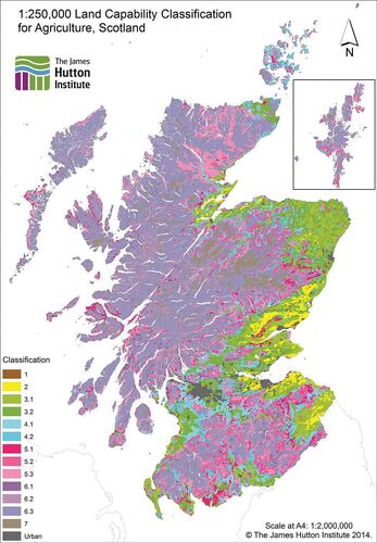 Skotsko má asi 6,2 milionů hektarů zemědělské půdy, což je necelých 80 % celkové rozlohy země. Více než polovina zemědělských ploch jsou ale chudé pastviny včetně asi 600 tisíc ha společných pastvin, necelá čtvrtina jsou intenzivnější travní porosty na orné půdě, dalších 10 % ostatní orná půda a zbytek jsou lesy (většinou ve veřejném vlastnictví) či ostatní plochy. Na orné půdě se pěstují zejména obiloviny (80 % ploch), toho jsou skoro tři čtvrtiny zejména jarního ječmene (mimo jiné na whisky), druhá v pořadí je pšenice a následuje oves. Na přibližně 34 tis. ha je řepka, necelých 30 tis. ha pokrývají brambory. Velmi důležitou a ziskovou komoditou jsou ve Skotsku – zejména v oblasti Fife, jahody, maliny a další drobné ovoce, které se často pěstuje pod krytem.