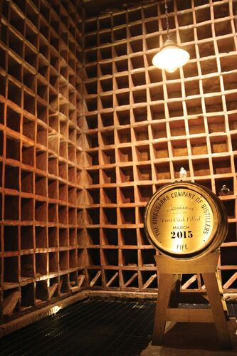 Destilát se pak mísí s vodou a stáčí do dubových sudů (v Kingsbarns používají americký sud z Kentucky), kde zraje minimálně tři roky a jeden den (ten jeden den navíc je kvůli přestupnému roku), většinou ale o hodně déle. Každý rok se ze sudu vypaří 2 % objemu, tzv. andělská daň. Teprve z konečného množství stočeného do lahví se pak platí ta skutečná daň státu. Kingsbarns pak stejně jako většina palíren whisky neprodává tzv. single malt whisky, ale míchá různé druhy whisky do finální chuti a produkt tedy označuje jako blended whisky. První lahve uvedli na trh v roce 2018, aktuálně už výroba běží naplno a ročně se zde vyrobí 200 tisíc lahví.