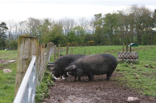 Pro doplnění sortimentu je na farmě také několik desítek prasat na výkrm, ale chov není příliš ekonomický, proto je omezen jen na devět kusů prasnic. Prasata jsou chována na pastvině, výběr plemen je proto opět směřován na odolná, pomalu rostoucí a výhradně lokální britská plemena, která jsou už v současnosti velmi málo početná – Berkshire, Tamworth a Large Black. Poráží se zhruba 65 prasat ročně – ve Skotsku nemá vepřové maso příliš velkou tradici, daleko oblíbenější je celkem logicky hovězí a jehněčí, takže k pokrytí poptávky to stačí.