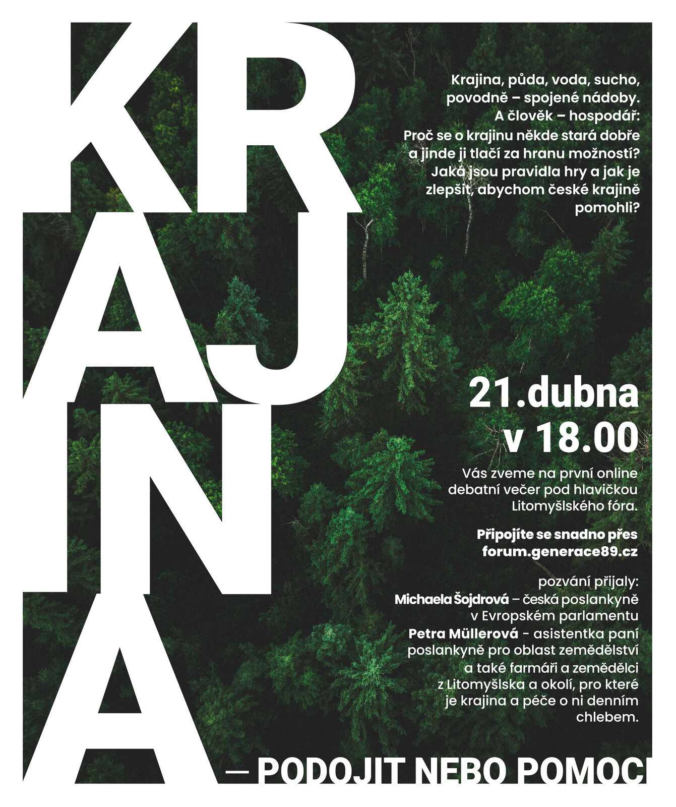 Všichni příznivci životního prostředí jsou zváni na online debatu ke DNI ZEMĚ o krajině, půdě, vodě a nás, kterou v rámci Litomyšlského fóra organizuje Fórum Generace 89 společně s Evropským parlamentem. Hlavním hostem bude europoslankyně Michaela Šojdrová, pozvání laskavě přijali i farmáři z okolí Litomyšle.