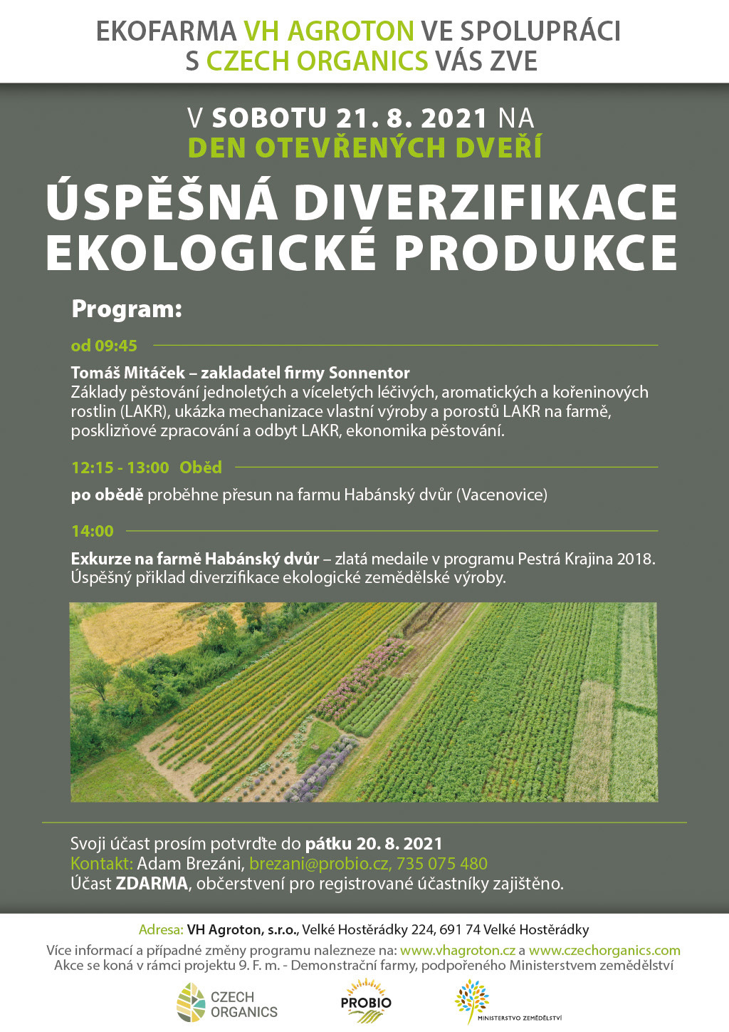 V sobotu 21. 8. 2021 od 09:45 zakladatel firmy Sonnentor Tomáš Mitáček nám předvede, že pěstování léčivých, aromatických a kořeninových rostlin (LAKR) může být pohodové i když náročné, barevné, ale i ekonomicky výnosné! Dozvíte se, jaké jsou první kroky úspěšného pěstování jednoletých a víceletých LAKR. Ukážeme si mechanizaci a posklizňovou linku vlastní výroby. Na VH Agroton budou k vidění demonstrační porosty LAKR. Tomáš poradí, jak si může farmář zajistit odbyt a také bude zmíněna ekonomika pěstování. Provedeme vás rokem meduňky se vším všudy! Po obědě se účastnící vlastní dopravou přesunou na farmu Habánský dvůr ve Vacenovicích, kde proběhne exkurze. Farma byla oslovena jako příklad rodinné farmy, která úspěšně diverzifikovala ekologickou produkci.