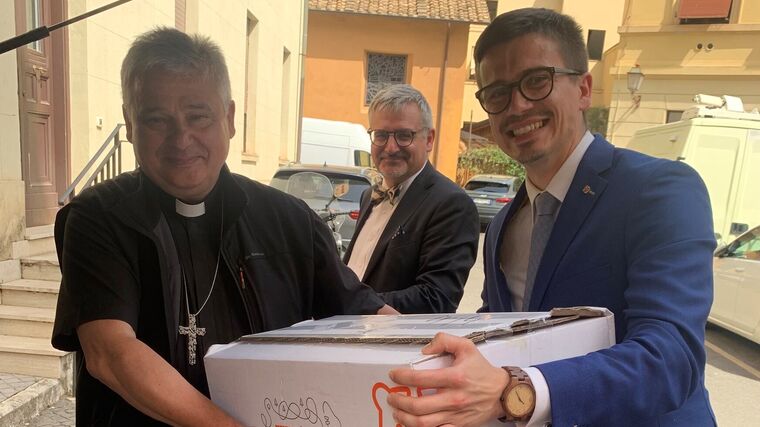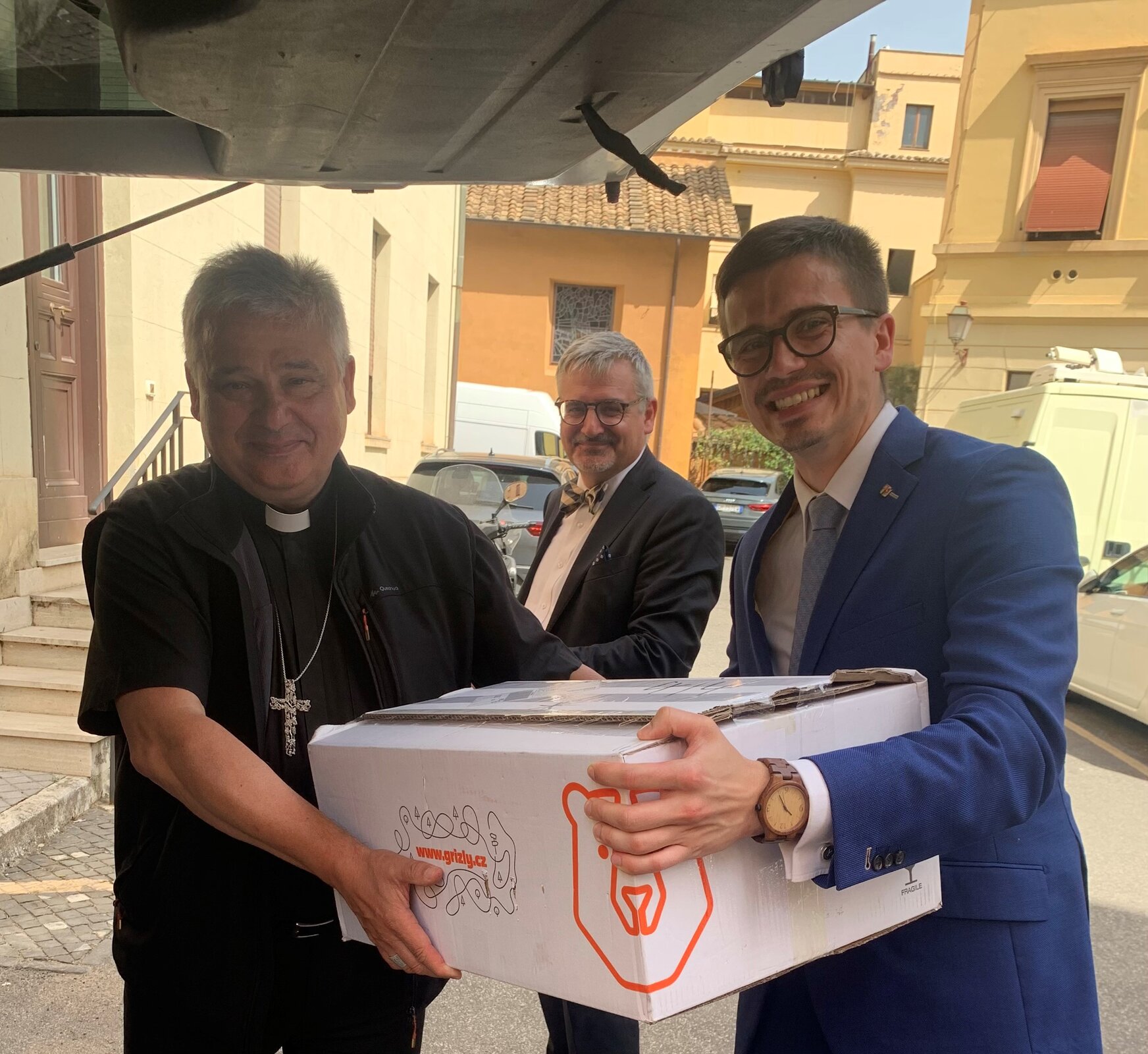 Celou akci organizačně zaštítil pan velvyslanec Václav Kolaja, který přišel s návrhem darování trvanlivých potravin papežské almužně, v jejímž čele stojí kardinál Konrad Krajewski.